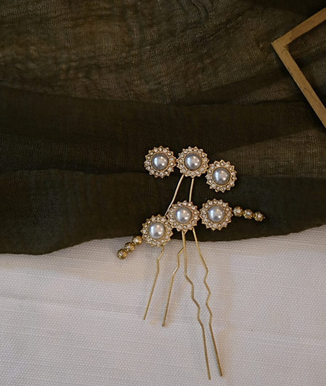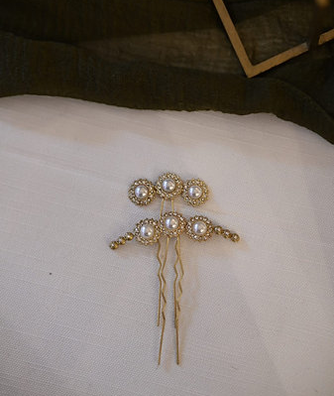Piezas de latón soldadas a fuego, en tono dorado brillo con perlas y cristales.
